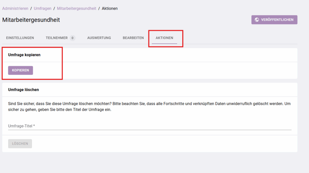 Gehen Sie hierzu in die entspechende Umfrage und klicken auf auf die Registerkarte „Aktionen“. Danach können Sie die Umfrage über den Button „Kopieren“ duplizieren.