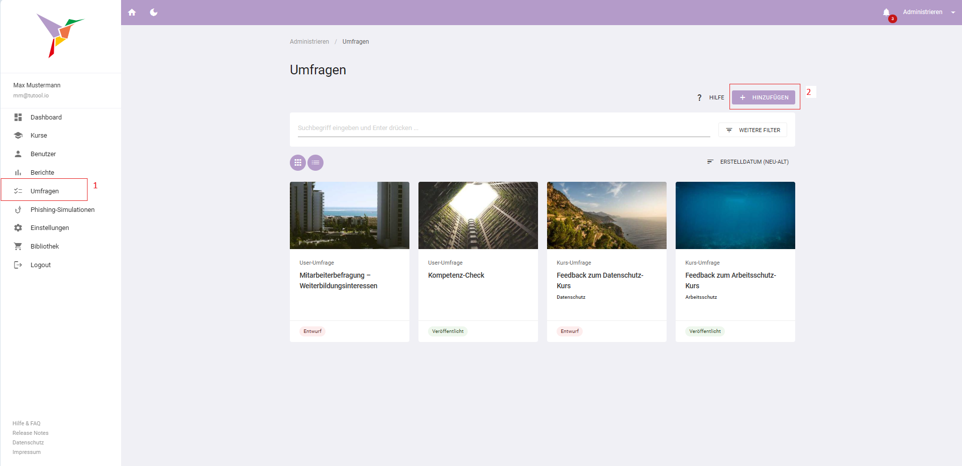 - Klicken Sie auf +HINZUFÜGEN, um eine neue Umfrage zu erstellen.