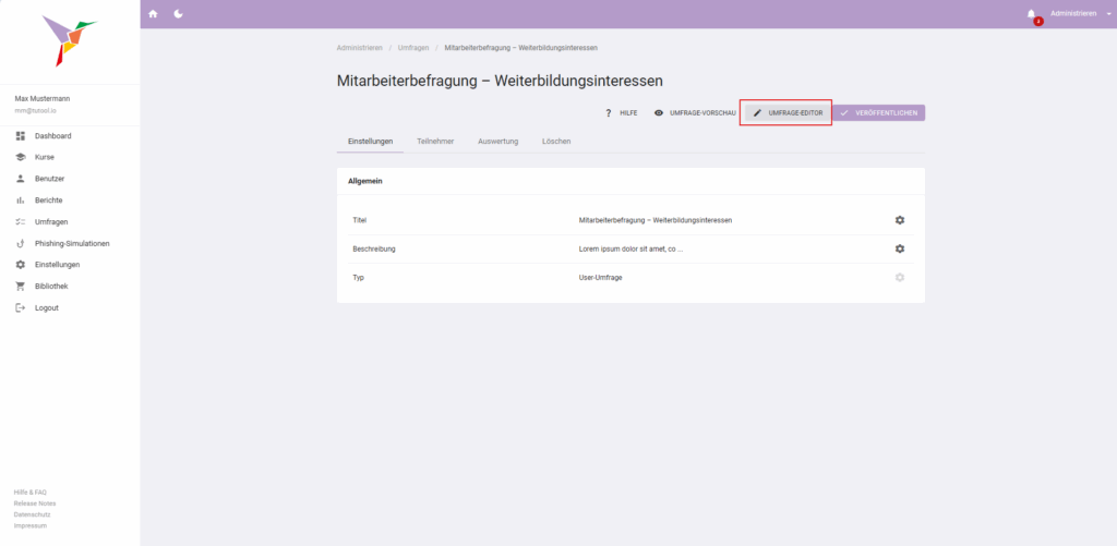 Um die Umfrage bearbeiten zu können, klicken Sie auf „Umfrage-Editor“. Es öffnet sich die Benutzeroberfläche des Umfrage-Designers. So lange die UMfrage noch nicht veröffentlich ist, können unbegrenzt viele Änderungen vornehmen.