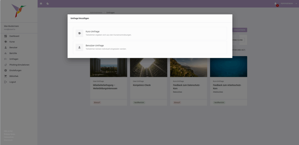 3. Wählen Sie, ob die neue Umfrage einem Kurs hinzugefügt werden soll, z.B. als Evaluierungsfragebogen für alle Kursteilnehmer, oder ein neuer Verteiler ohne Kurs-Bezug erstellt werden soll.
