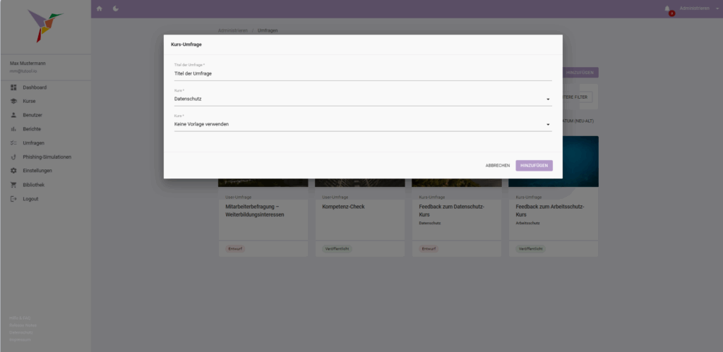4. Im nächsten Schritt legen Sie den Titel der Umfrage fest und im Falle eines Kurs-Bezugs können Sie den Kurs auswählen, zu dem die Umfrage hinzugefügt werden soll.