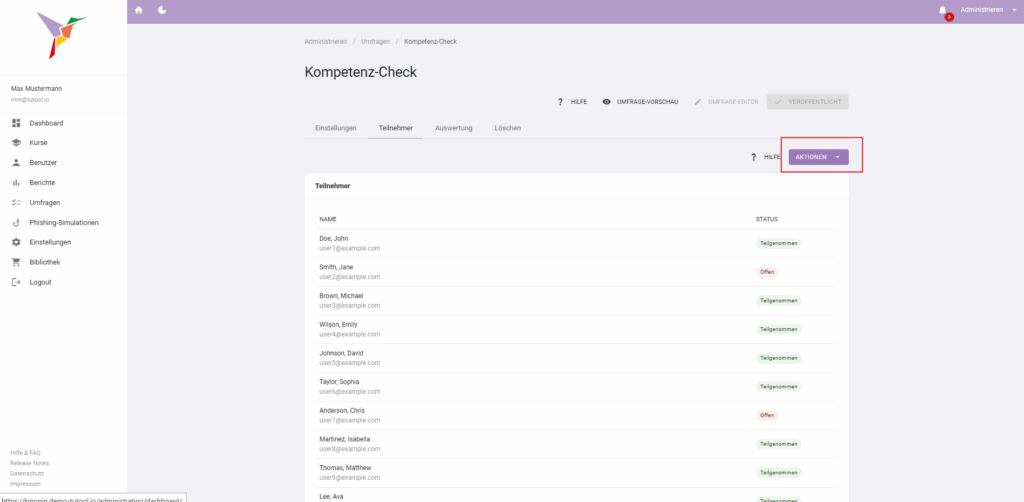 Für Umfragen ohne Kursbezug können Sie die Teilnehmenden festlegen, sobald die Umfrage veröffneltich ist. Klicken Sie dafür auf den Button „Aktionen“ und fählen Sie „Teilnehmer hinzufügen“ oder „Teilnehmer löschen“. Sie können nun aus den User auswählen, die Ihnen entsprechend Ihrer Rechte- und Rollen-Einstellung zugeteilt sind.